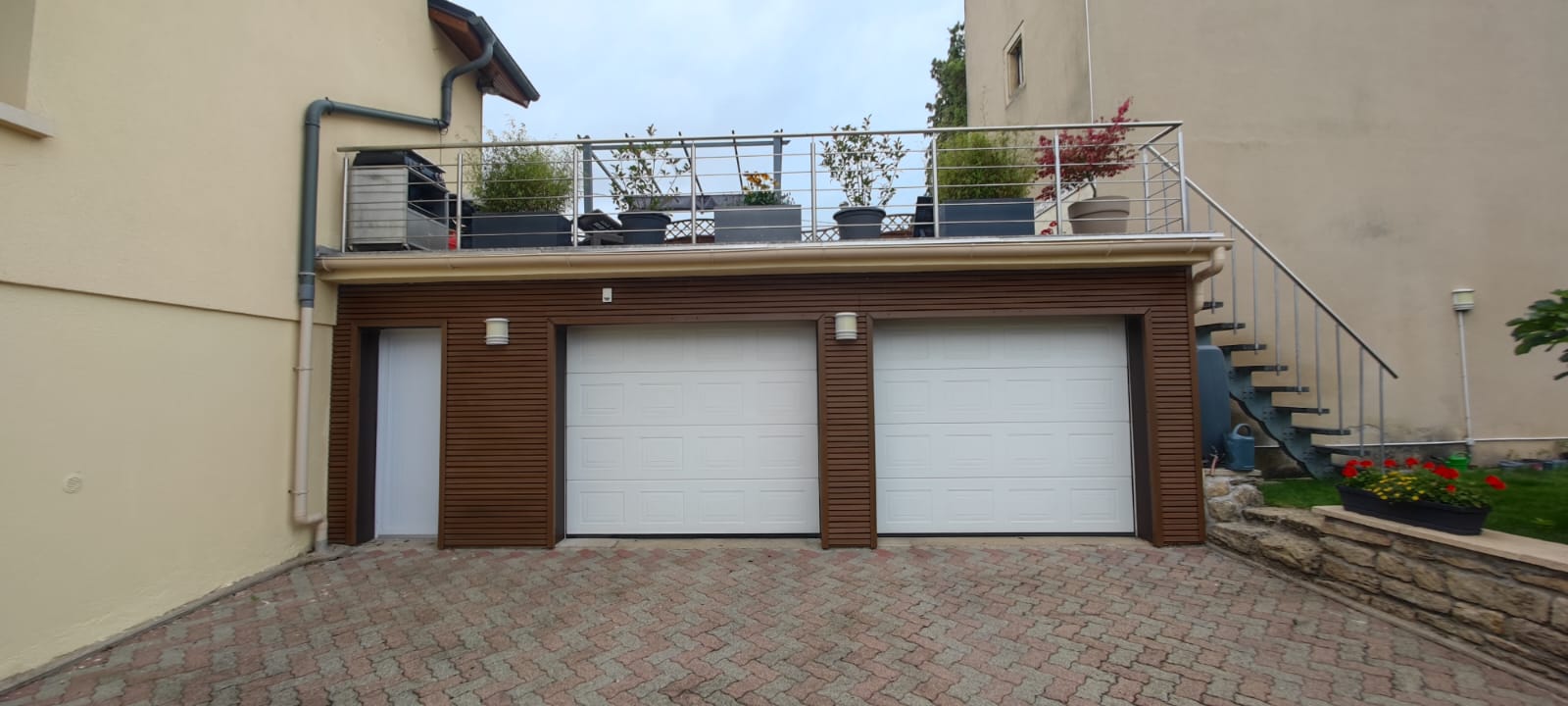 La maison propose un double garage avec deux portes électriques qui peut accueillir deux voitures. Deux emplacements privatifs devant les garages.