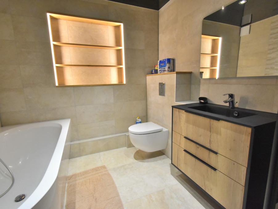 Au premier étage, vous trouverez un dégagement qui dessert deux chambres (dont une avec balcon) et une salle de bain avec baignoire, meuble vasque et WC