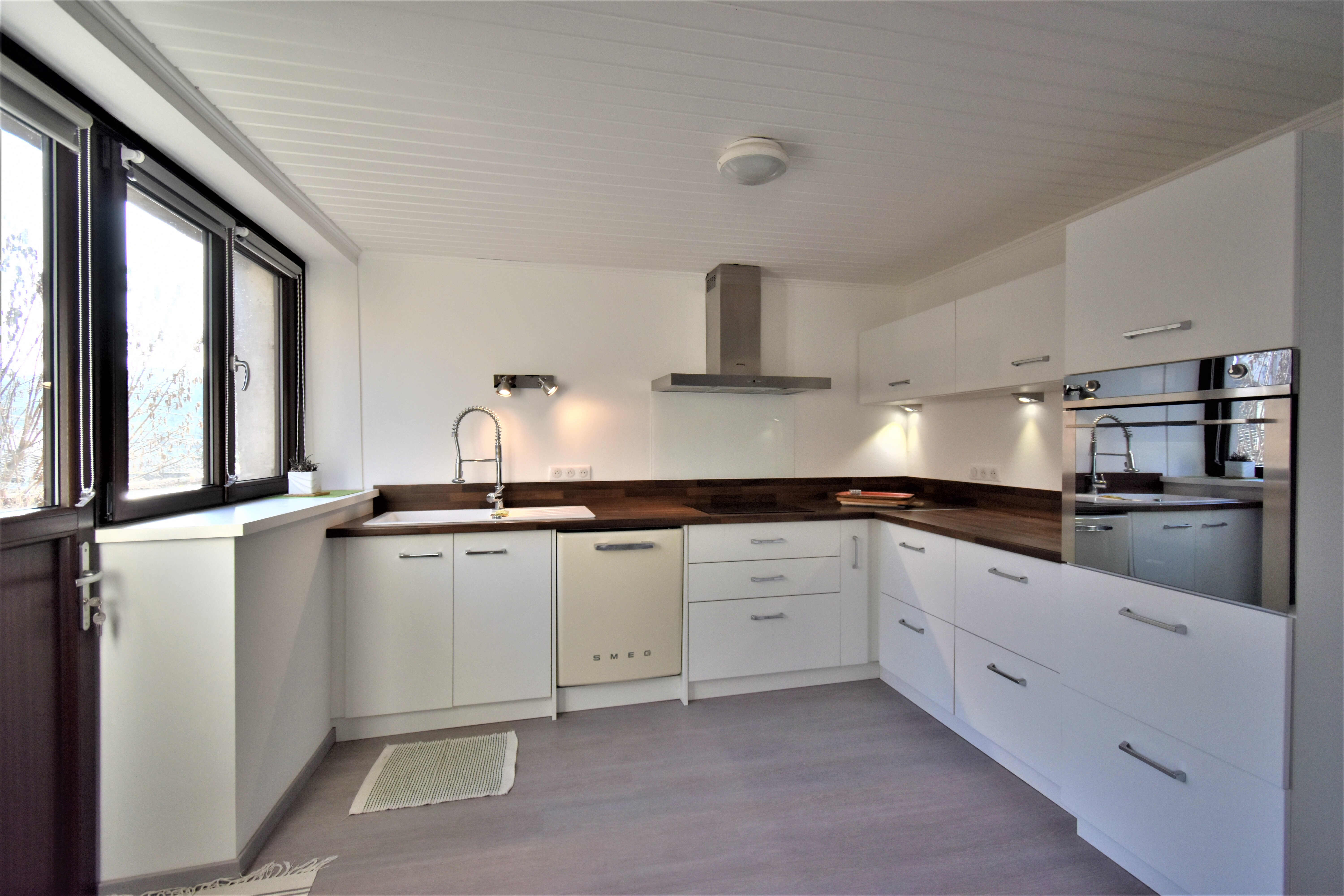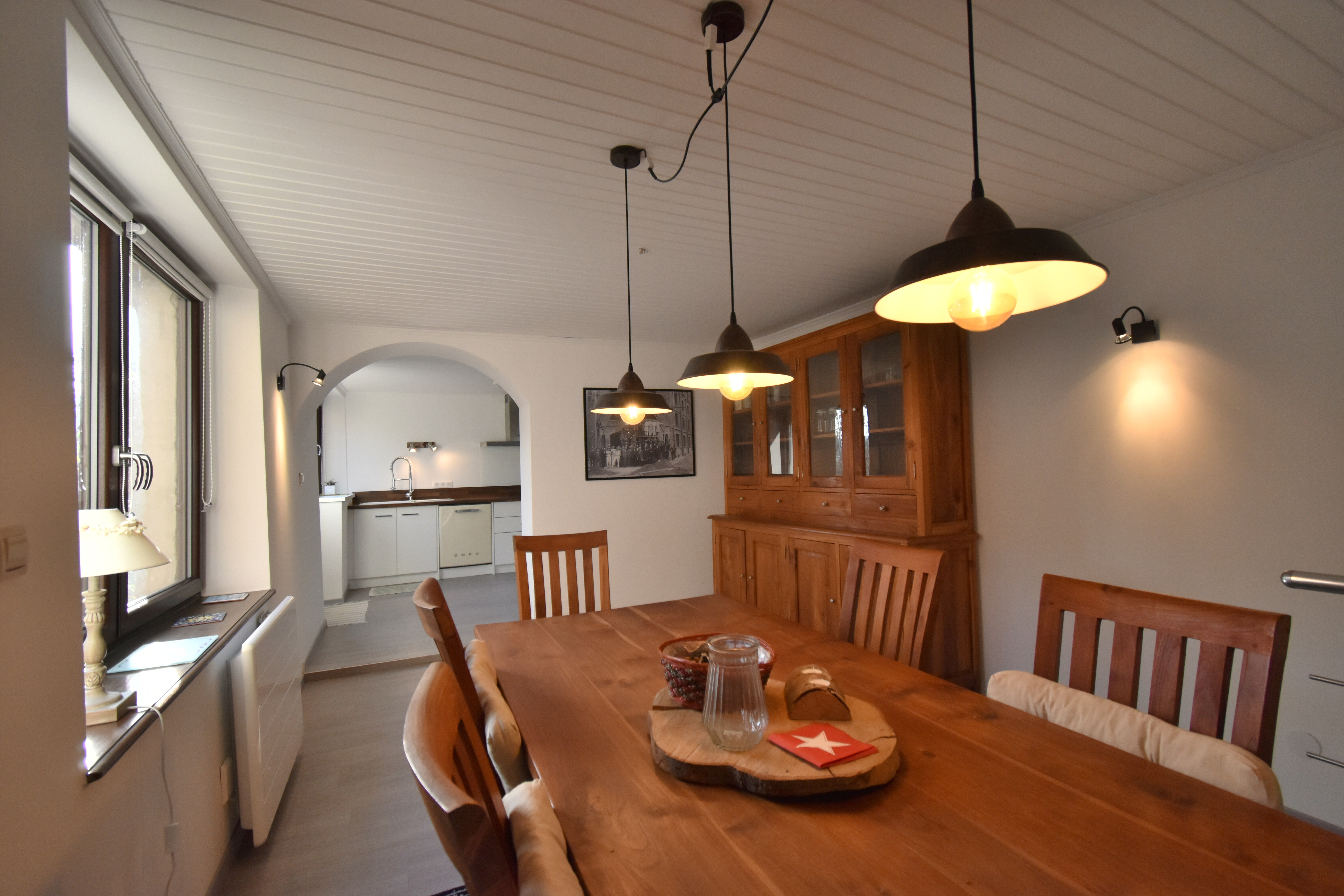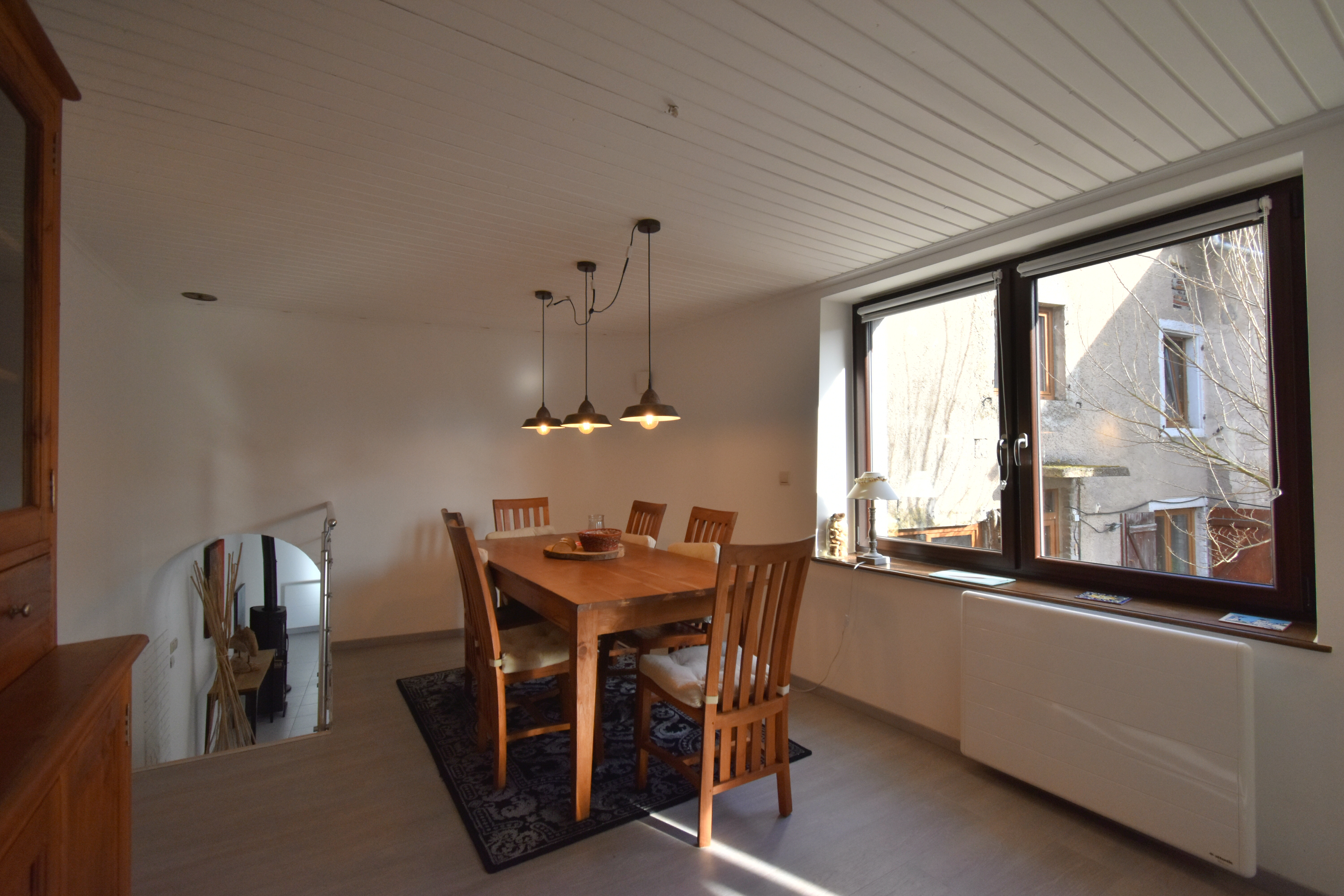 7 marches donnent accès à la salle à manger et à la cuisine équipée (la cuisine donne également accès à la terrasse)
