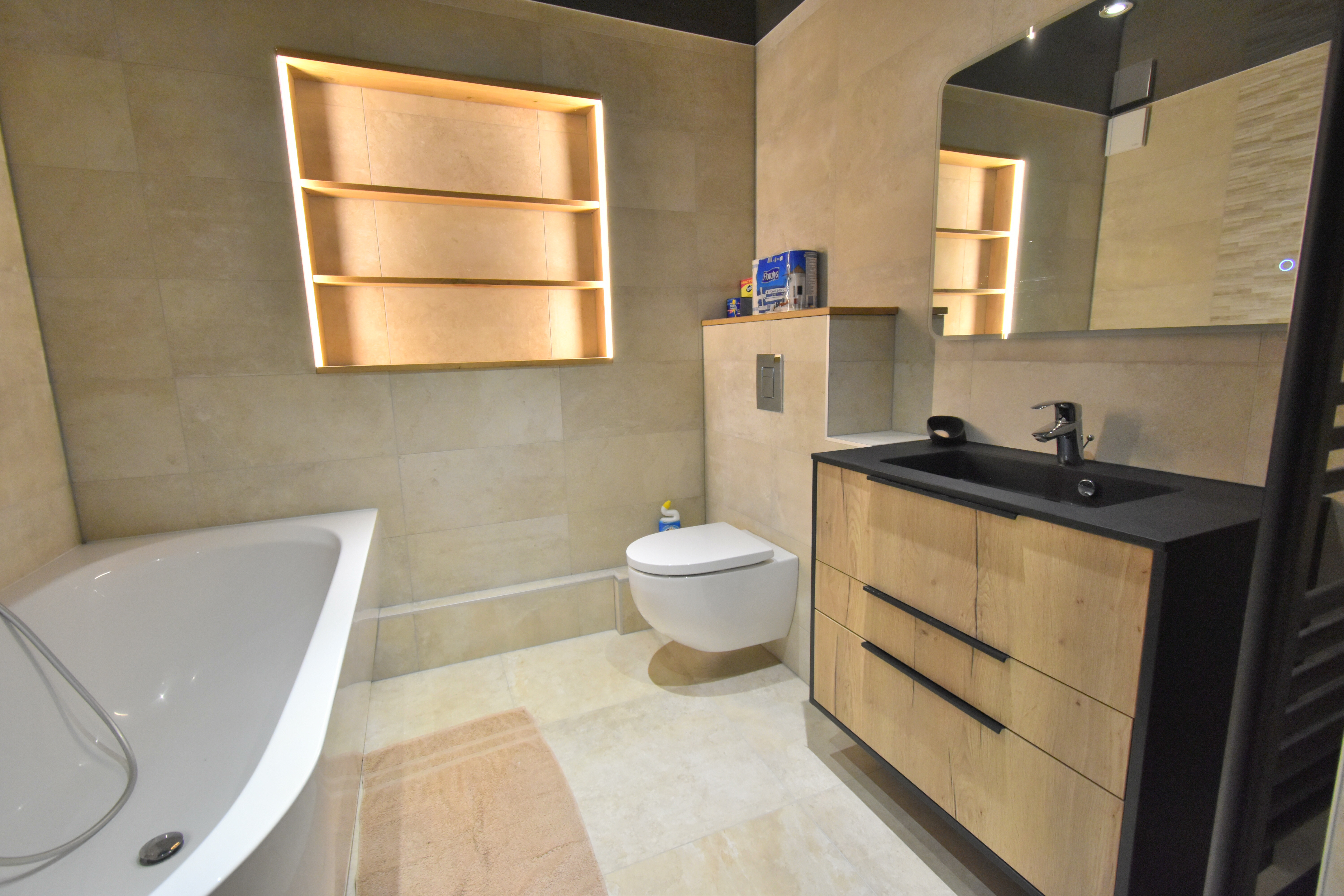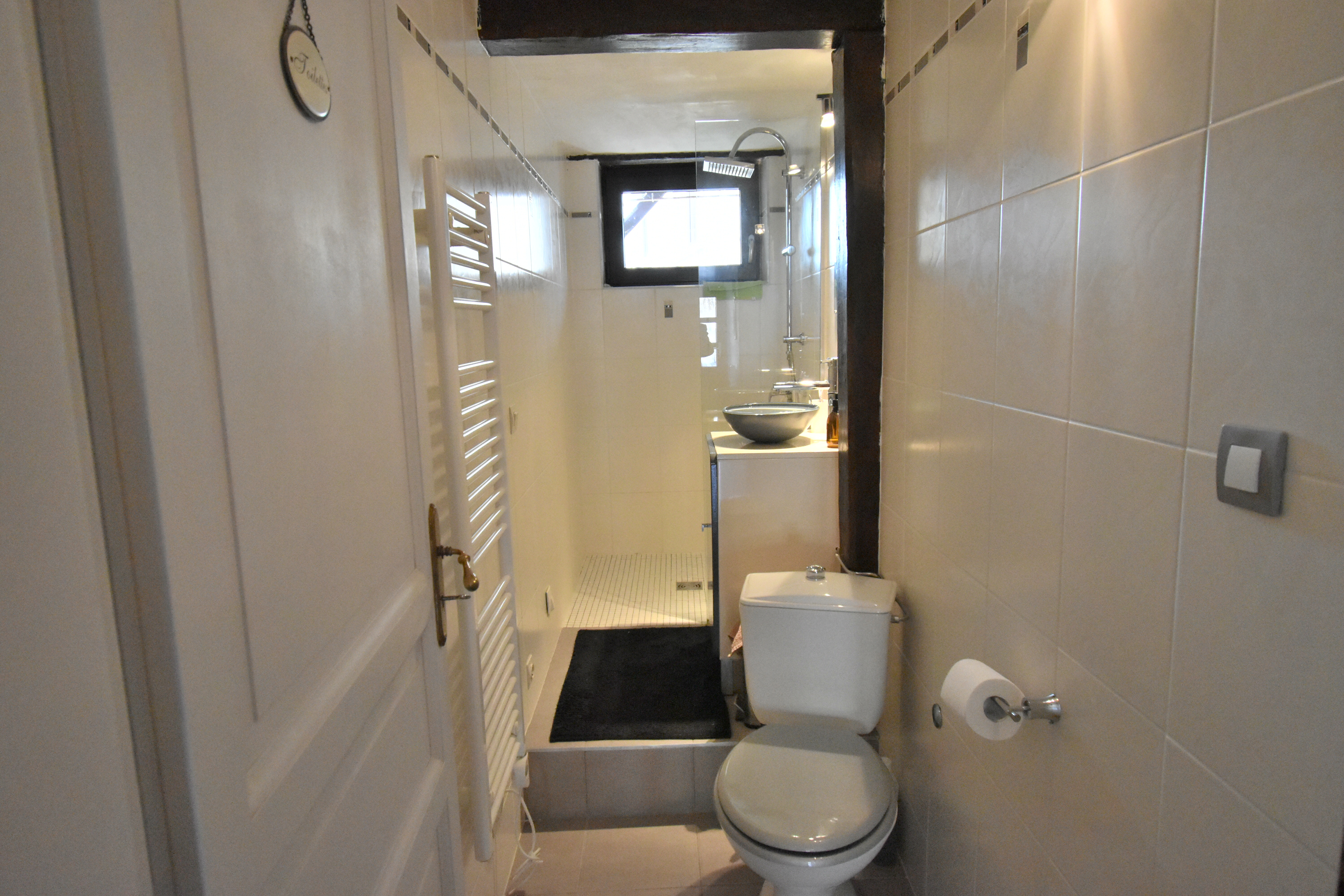 Au Rez-de-Chaussée un couloir d'entrée, une grande pièce à vivre (avec un poêle à bois) qui donne accès à la terrasse, une chambre (ou un buerau), une salle d'eau avec meuble vasque, douche à l'italienne et WC